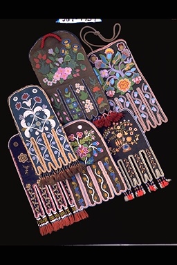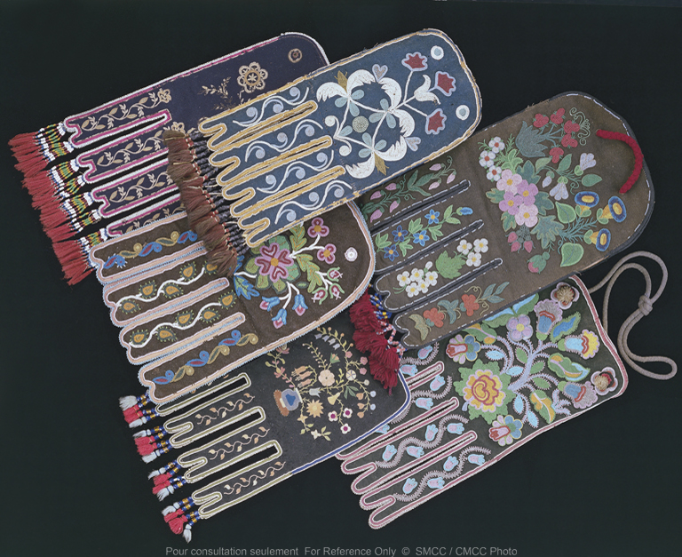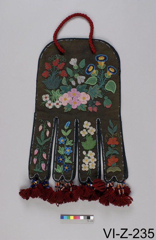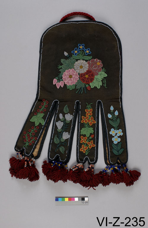 | | Additional Information | Floral designs on articles made by the Indians of the northern forests were once thought to be traditional Native motifs. Yet, such patterns are seldom seen on items made before 1800, and were never present in prehistoric Native art expressions. The designs on this mid-nineteenth-century Métis pouch clearly represent European flowers in compositions that are reminiscent of colonial folk art. This influence is not surprising when we consider that Ursuline nuns in Québec in the mid-1600s had started mission schools in which they instructed Native girls in the art of embroidery. Truly floral art, however, had its genesis in the Great Lakes region in the late eighteenth century. There, Métis women living at missions and fur trade posts integrated realistic floral designs into their pictorial vocabulary. By the time the Métis had settled on the Red River, their floral artistry was so distinctive that they came to be called the Flower Beadwork People by the Indians of the region. Gradually, through trade and intermarriage with the Métis, Native peoples began to borrow their brilliant floral motifs, and the style spread throughout northwestern Canada, leading to the development of several local variants. Pictured here is a Métis octopus pouch - so called for the four double tabs at the bottom. Made of cloth, such pouches were embroidered with silk thread or beads, and were used for carrying pipe, tobacco, and flint-and-steel.
