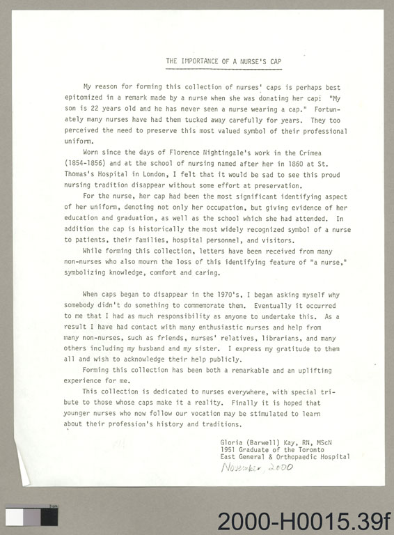 Until the 1970s, trained nurses were instantly recognized by their caps. Each school and hospital had its own cap design and means of indicating the level of training. Today this symbol of knowledge and caring has all but disappeared. Gloria Kay, a retired nurse, believed that the caps should be preserved, and in 1974 began a collection of caps, which nurses all across Canada sent to her. Excerpt from exhibition text: Symbol of a Profession: A Century of Nurses' Caps, February 2001 to January 2003 |